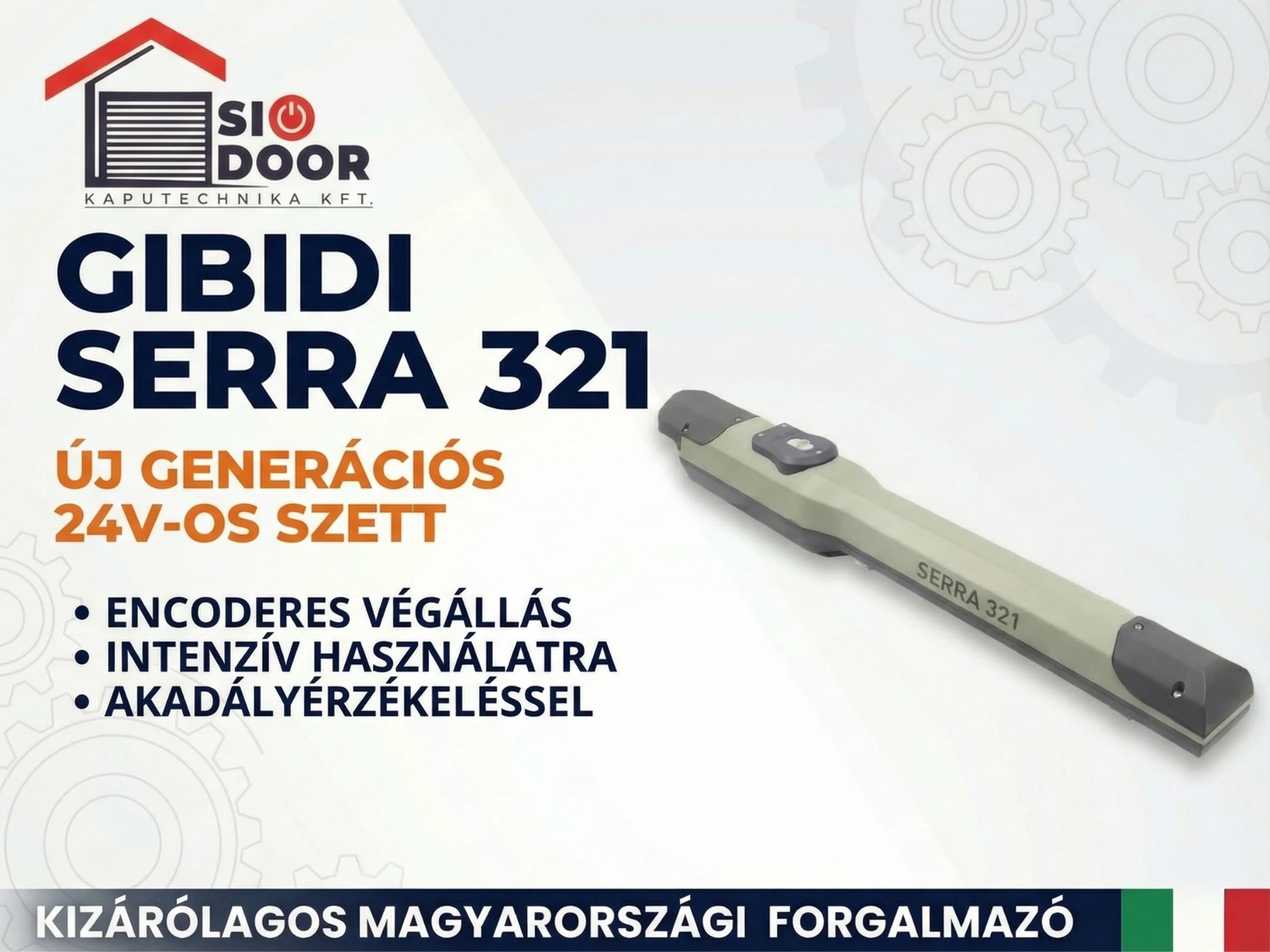 A SERRA 321 a GIBIDI legendás megbízhatóságát ötvözi a legmodernebb **24 Voltos** rendszerrel. Ez a motor (amely a SERRA 320 utódja) már beépített **Encoderrel** rendelkezik, így milliméteres pontossággal "tudja", hol tart a kapu, garantálva a tökéletes biztonságot és a folyamatos, intenzív működést. Magyarországon kizárólag a Sió Door kínálatában!